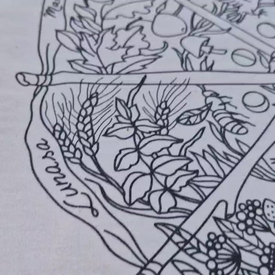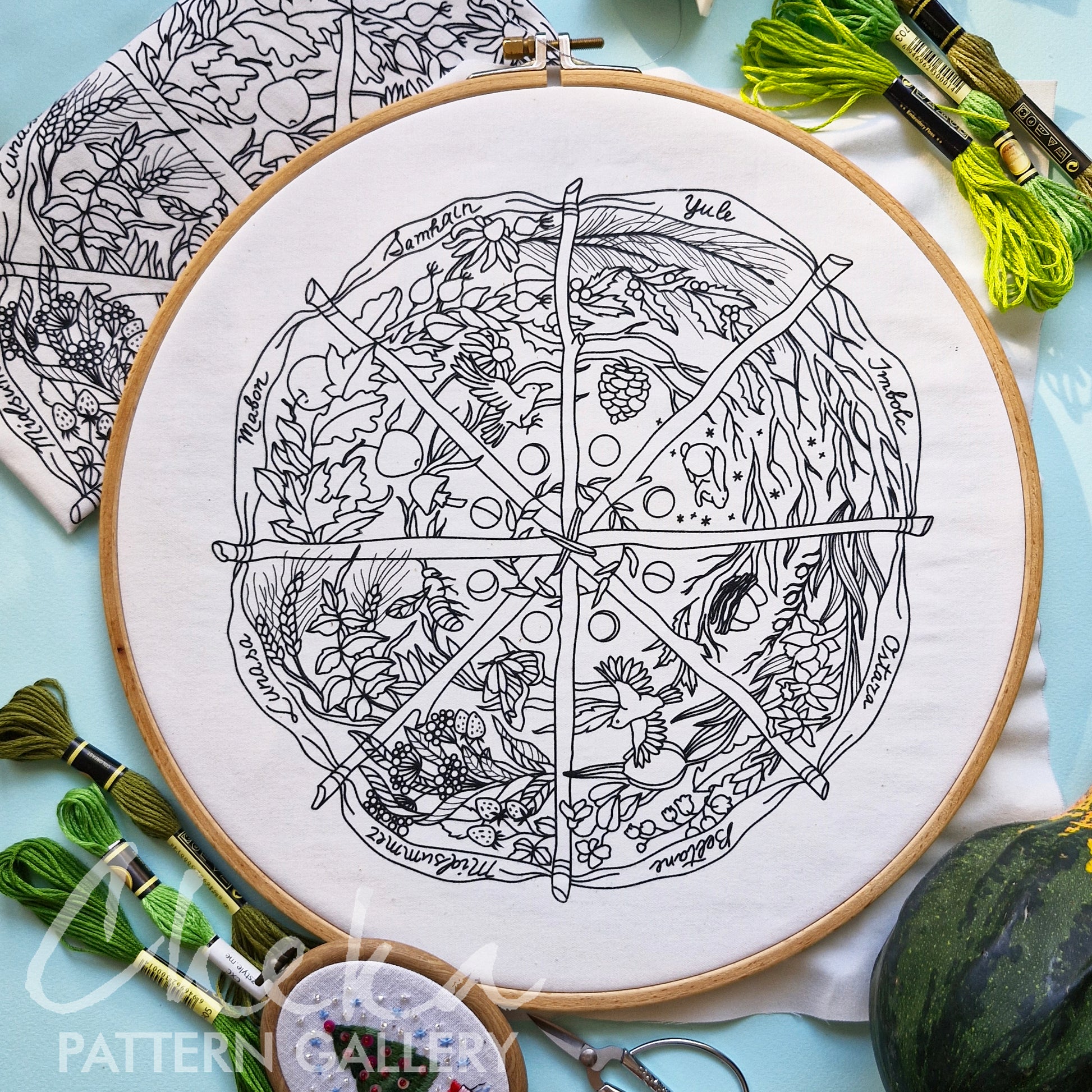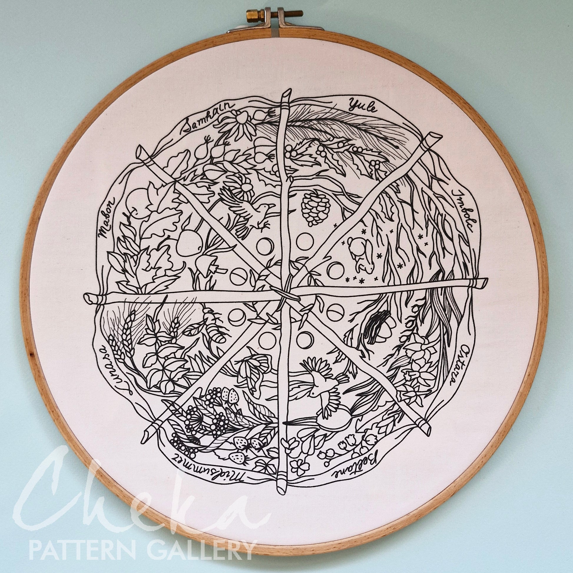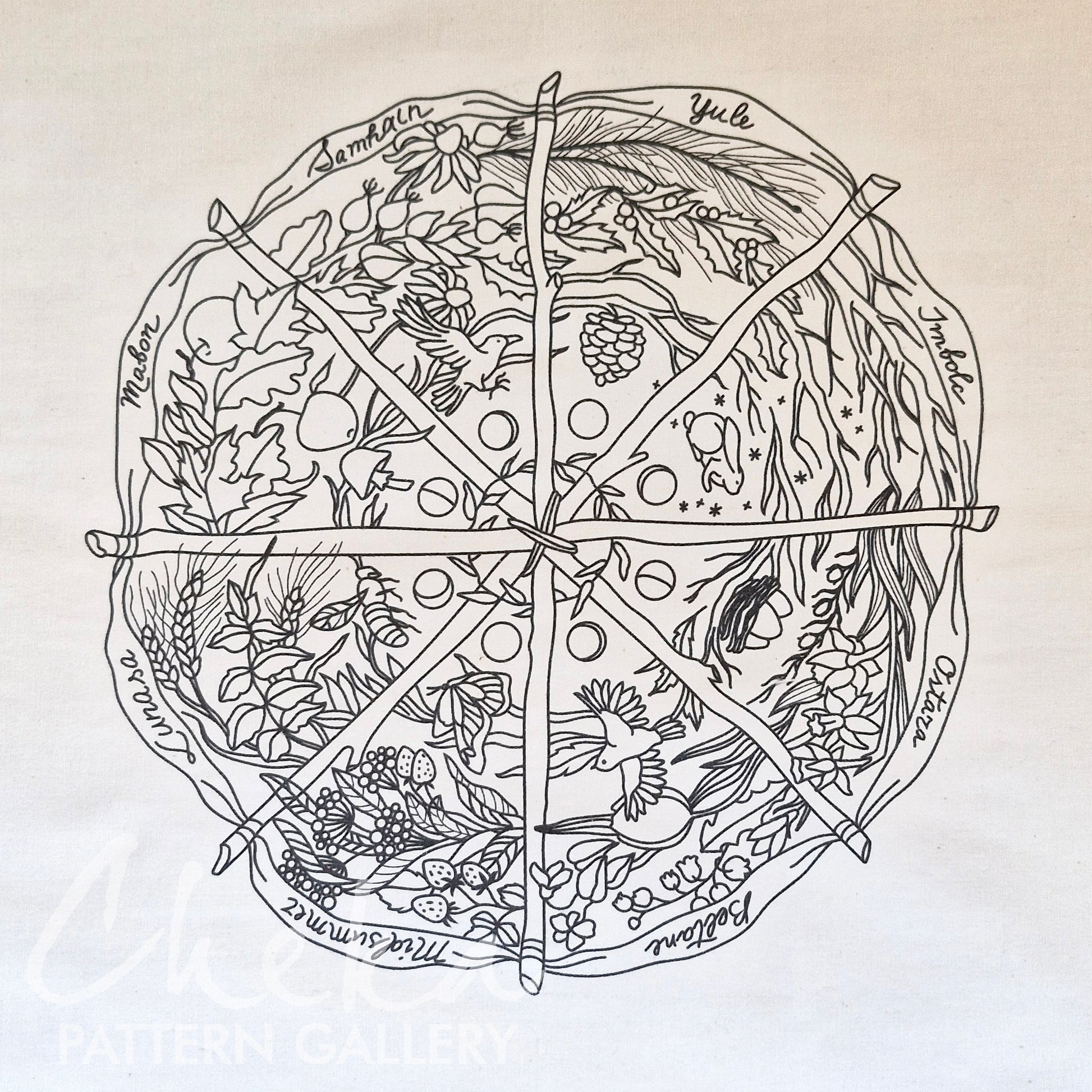 Calendar to embroider, sabbats phenology wheel. An Embroidery Canvas to Follow the Seasons
